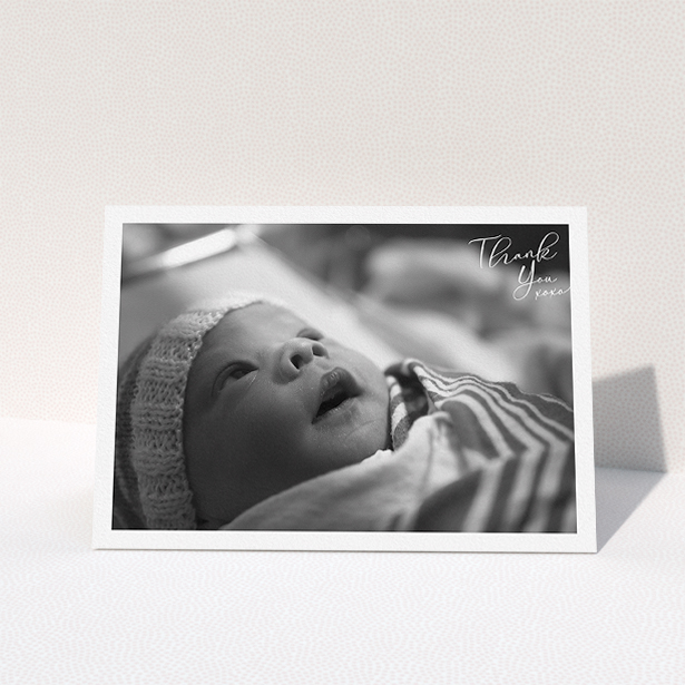 • A baby thank you card called "Flourished Thank You". It is an A5 card in a landscape orientation. It is a photographic baby thank you card with room for 1 photo. "Flourished Thank You" is available as a folded card, with mainly white colouring.