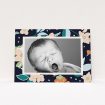 • A birth announcement card design named "Sleepy Time". It is an A5 card in a landscape orientation. It is a photographic birth announcement card with room for 1 photo. "Sleepy Time" is available as a flat card, with tones of navy blue and white.