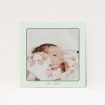 • A birth announcement card design titled "Over the Moon". It is a square (148mm x 148mm) card in a square orientation. It is a photographic birth announcement card with room for 2 photos. "Over the Moon" is available as a flat card, with tones of green and white.