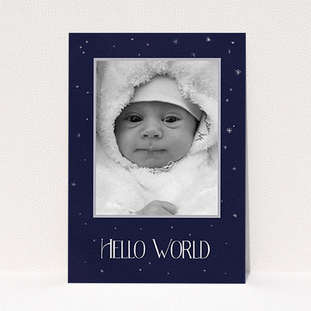 This is a baby announcement card with a quirky, modern and rustic look, designed with hues of navy blue and white. We think this new baby card design would be delightful for a son or a daughter.