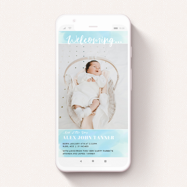 You can use your smartphone to tell your nearest and dearest about the arrival of your new son or daughter, with our “Watercolour Welcome Blue” smartphone birth announcement.