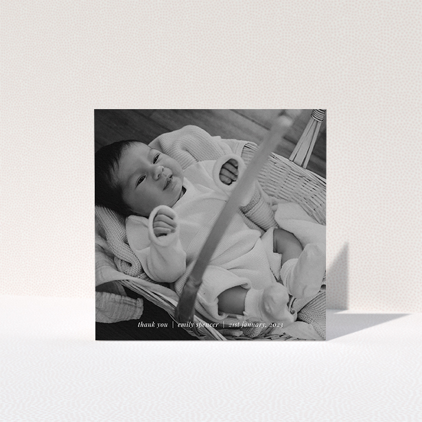 • A baptism thank you card design named "Sans Serif". It is an A5 card in a landscape orientation. It is a photographic baptism thank you card with room for 1 photo. "Sans Serif" is available as a folded card, with mainly white colouring.