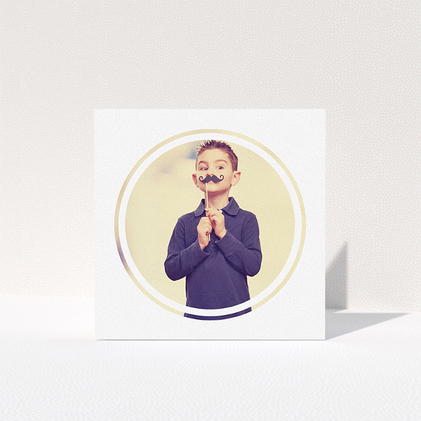 “Modern Circle Frame” has been created to hold an individual large photograph of your son or daughter on the front face of the card.