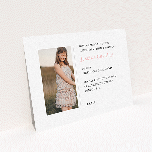 • A first holy communion invitation called "Simple Side Frame". It is an A6 invite in a landscape orientation. It is a photographic first holy communion invitation with room for 1 photo. "Simple Side Frame" is available as a flat invite, with tones of white and pink.
