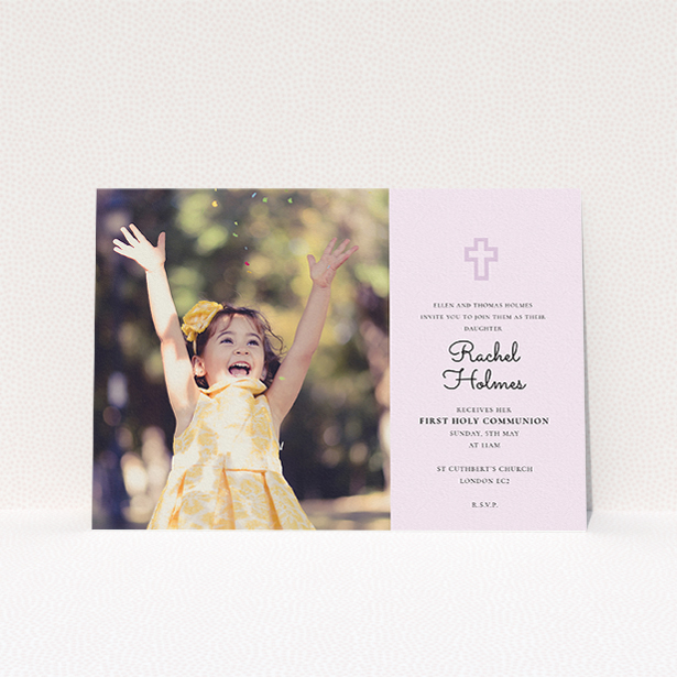 Assemble your nearest and dearest to join you for your young son or daughter’s communion ceremony, with this straightforward first holy communion invitation design.