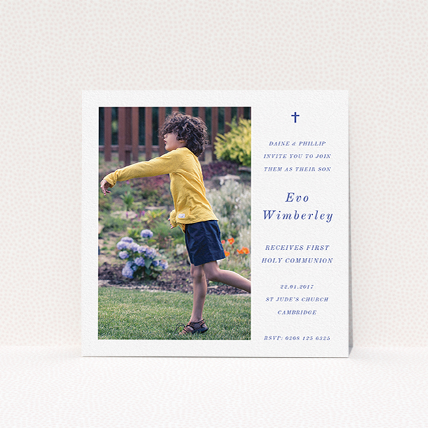 This first holy communion invitation is predominantly white but has whispers of blue, and a modern style to it. A Christian cross helps this invitation design make a real impact.