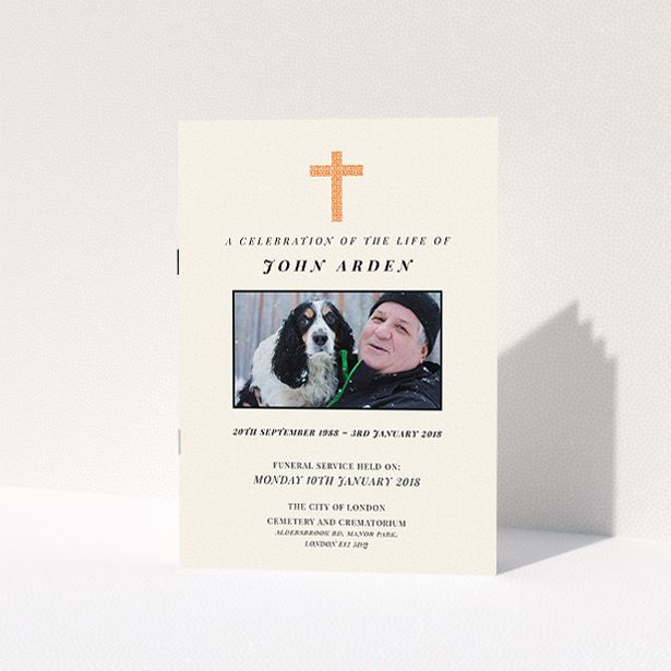 A cream and orange, a5 portrait stapled funeral order of service with a simple style.