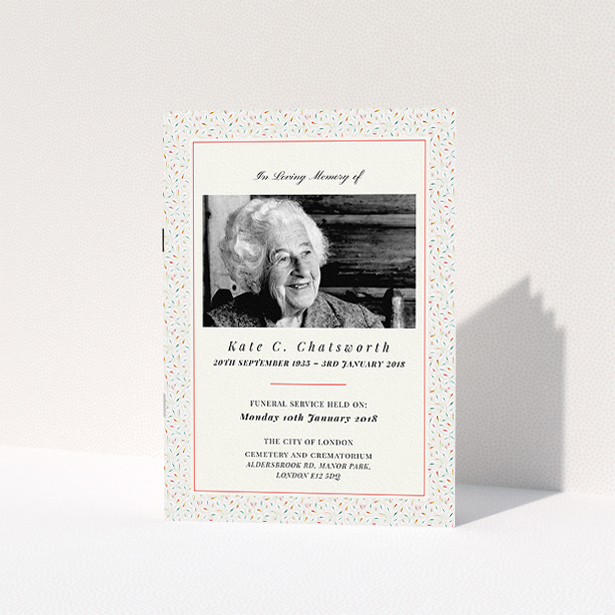 A light cream and green, a5 portrait stapled funeral order of service with a colourful style.