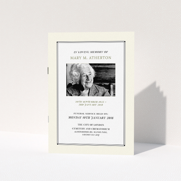 “Cream art deco” funeral order of service was created to help a funeral or memorial service run as simply as possible at one of life’s saddest times.