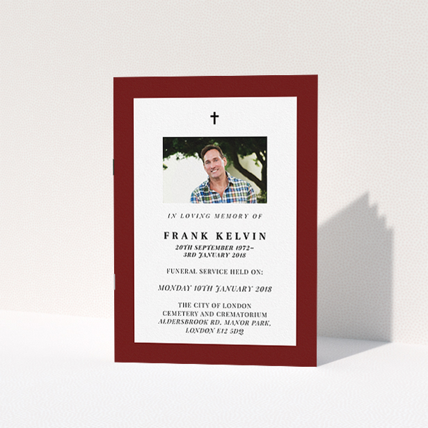 Aesthetically, this funeral order of service holds a simple as well as religious style, with burgundy acting as the primary colour. As a design feature, this order of service has a Christian crucifix as the centre of attention.