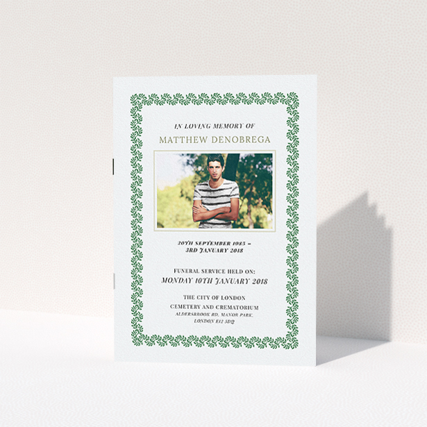 Green makes up a key part in this funeral order of service booklet design, and helps emphasise it’s floral character.