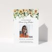 A white and green, a5 portrait multipage funeral programme with a floral style.