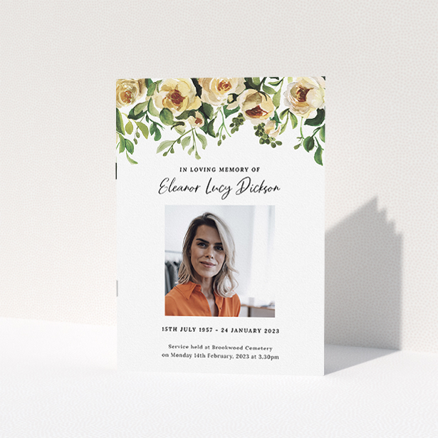 “Yellow roses” is a classic, editable funeral order of service booklet, built to aid you in guiding your loved ones through the hymns and prayers of a funeral or memorial ceremony.