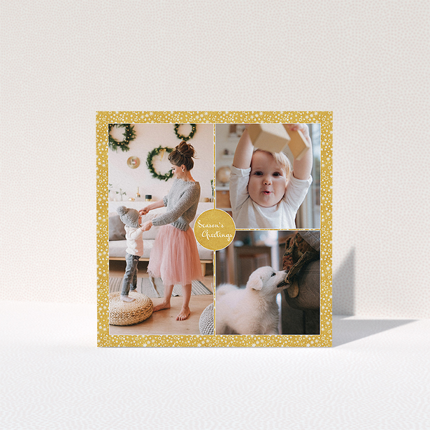 This versatile Christmas card template is taken up by a gold tone. As a design attribute, this card has a handwritten font as the central focus.