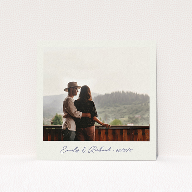 • A personalised wedding invitation design named "Hoxton Square". It is an A5 invite in a portrait orientation. It is a photographic personalised wedding invitation with room for 1 photo. "Hoxton Square" is available as a flat invite, with mainly white colouring.