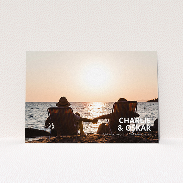 • A wedding save the date card design named "Across the Photo". It is an A5 card in a landscape orientation. It is a photographic wedding save the date card with room for 1 photo. "Across the Photo" is available as a flat card, with mainly white colouring.