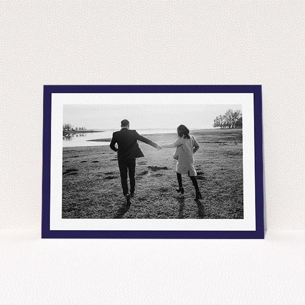 As a photographic wedding save the date design, “Classic Navy Photo Frame” has been created to carry 1 large photograph of you and your fiancée/fiancé . It’s a cheerful method of adding a personal feature to your wedding stationery.