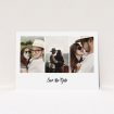 • A wedding save the date card named "Central Script". It is an A5 card in a landscape orientation. It is a photographic wedding save the date card with room for 1 photo. "Central Script" is available as a flat card, with mainly white colouring.