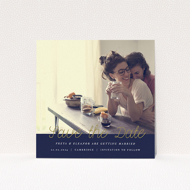 This delightful design is made up of a navy blue hue. A handwritten font helps this wedding save the date card make a big impact.