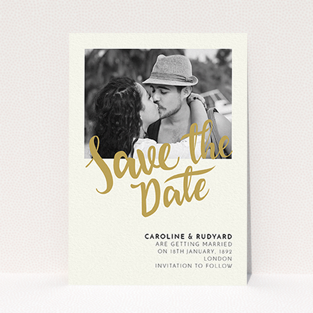 This wedding save the date card is predominantly a tone of cream, and has a charmingly modern appearance. As a design attribute, this card has a handwritten font as the centrepiece.