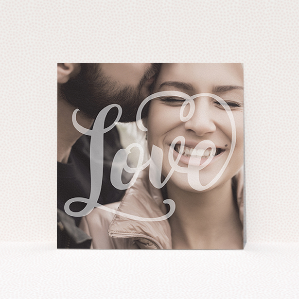 • A wedding save the date card template titled "Hoxton Square". It is an A5 card in a portrait orientation. It is a photographic wedding save the date card with room for 1 photo. "Hoxton Square" is available as a flat card, with mainly white colouring.