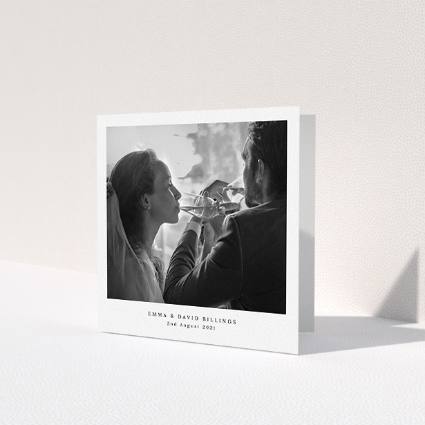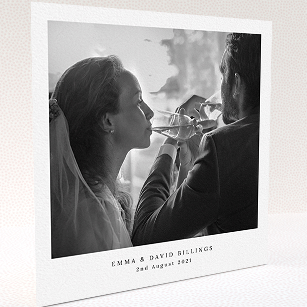 This is a folded (4-sided) design. It is square and comes in at 14.8cm wide by 14.8cm high when folded. This photographic wedding thank you card can carry 1 photo.