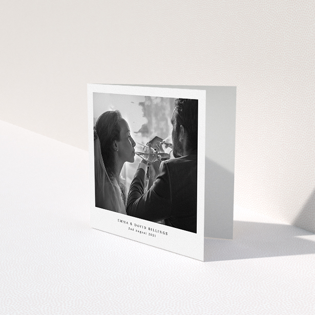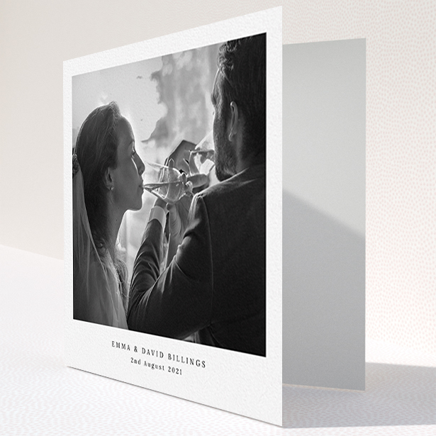 • A wedding thank you card design titled "Blenheim Palace". It is a square (148mm x 148mm) card in a square orientation. It is a photographic wedding thank you card with room for 1 photo. "Blenheim Palace" is available as a folded card, with mainly white colouring.