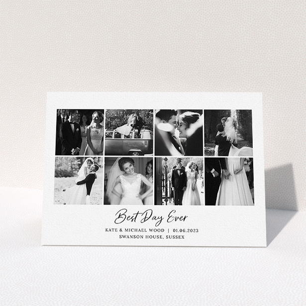 This card design has been designed to carry 8 photographs on the front. By including photographs of you and your other half from your wedding day, you can transform a classic wedding thank you card into fantastic keepsake of a marvellous day.