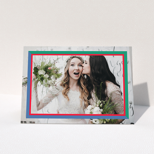 • A wedding thank you card design named "Bold Photo Corner". It is an A5 card in a landscape orientation. It is a photographic wedding thank you card with room for 1 photo. "Bold Photo Corner" is available as a folded card, with mainly white colouring.