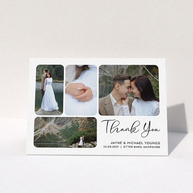 Show appreciation to your loved ones for helping make your marriage celebration so brilliant, with our “Rounded 4-photo Arrangement” wedding thank you card.