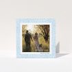 A blue and white, square traditional wedding thank you card with a colourful style.