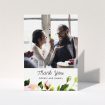 This card design has room for one large photo on the front page. By including a photograph of you and your partner from your wedding celebrations, you can change a standard wedding thank you card into a long-lasting token of a very important day.